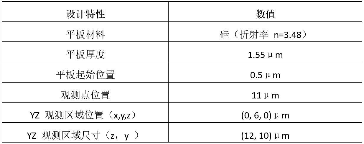第一種設(shè)計(jì)為介質(zhì)(硅)平板。該示例將展示無(wú)場(chǎng)聚焦的情況,并作為兩種透鏡設(shè)計(jì)的參考基準(zhǔn)。該平板也是后續(xù)兩種設(shè)計(jì)的基礎(chǔ),后兩種設(shè)計(jì)均通過(guò)在平板上蝕刻制成。