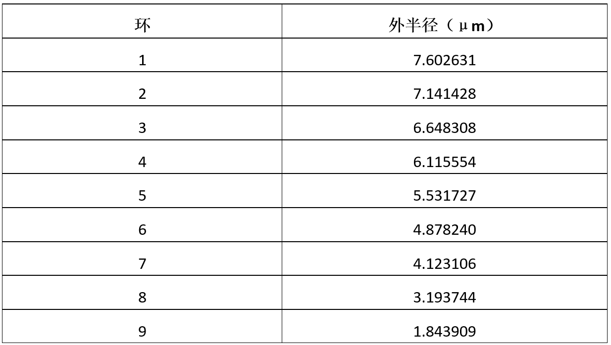 第一種透鏡示例為厚菲涅耳透鏡,其厚度與介質(zhì)平板一致(1.05μm)。每個(gè)環(huán)的起始半徑通過(guò)公式解析計(jì)算得出,如表 5 所示。利用這些半徑制作一系列尺寸逐漸減小的光纖波導(dǎo),材料在硅和空氣之間交替分配,中心區(qū)域?yàn)榭諝狻9饫w波導(dǎo)通過(guò) OptiFDTD 中的 VBScripting 腳本制作。