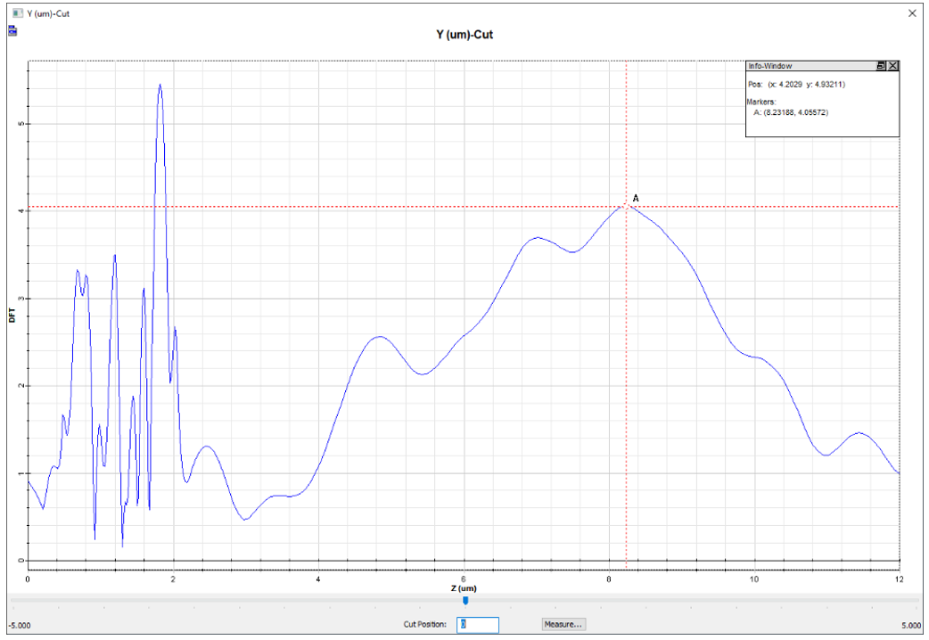 采用菲涅耳透鏡設(shè)計(jì)后,光線實(shí)現(xiàn)了場(chǎng)聚焦(如圖 5 所示)。沿 z 軸切片(如圖 6 所示)顯示,焦點(diǎn)峰值位于 8.2319μm 處。