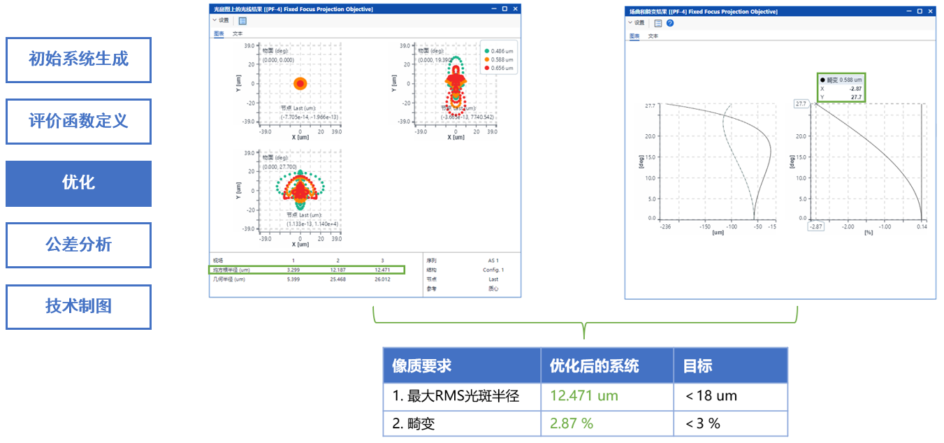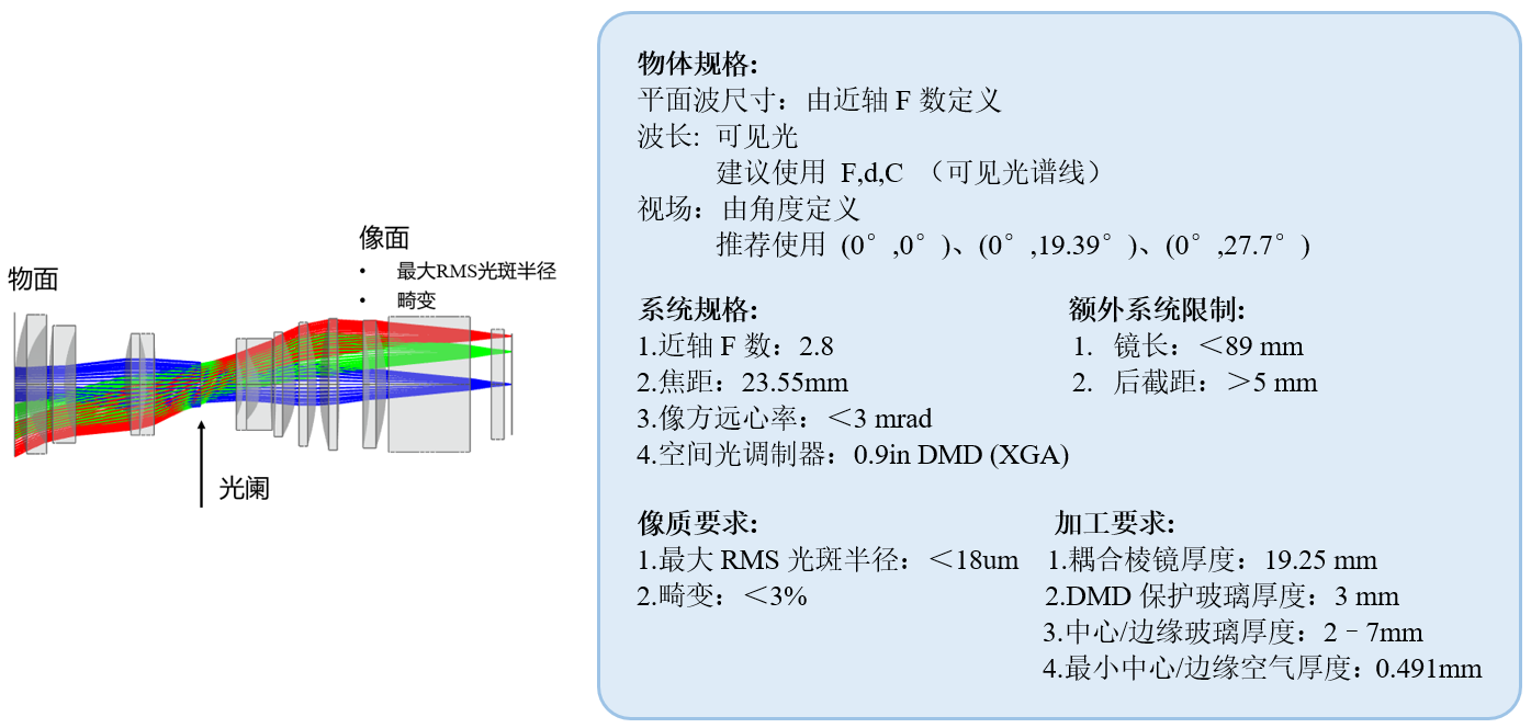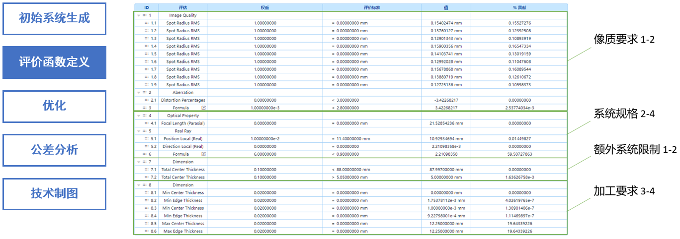 根據系統規格、額外系統限制以及像質與加工要求,定義了各種與之對應的評價函數。