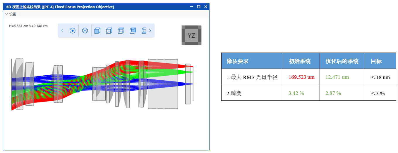 定焦投影物鏡廣泛應用于光刻、投影顯示和工業檢測等領域,憑借其固定焦距設計,實現了成像穩定性與高分辨率的結合,具有畸變小、像質均勻等優點。在本案例中,將通過設計一個典型的定焦投影物鏡,演示在 VLU 中的光學設計流程,包括初始系統建立、像質分析、評價函數定義,優化以及結果展示。
