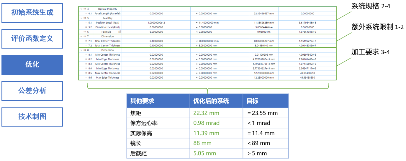 通過采用PSD算法進行優化后,滿足了像質要求 1-2、系統規格 2-4、額外系統限制1-2以及加工要求 3-4,此外系統規格1和加工要求1-2在初始系統生成時已滿足。