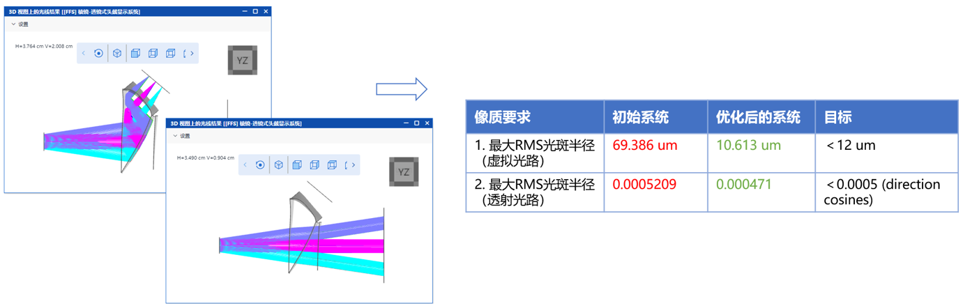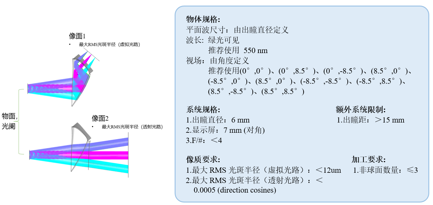 FFS(自由曲面)棱鏡-透鏡式頭戴顯示系統廣泛應用于光學透視式增強現實(AR)與混合現實(MR)設備中,例如智能頭戴設備、工業輔助裝配、醫學可視化以及仿真訓練系統。該類光學系統通過自由曲面棱鏡實現光路折疊、虛像投射和透視光路合成,具備結構緊湊、重量輕、光效率高以及出瞳較大等優勢,特別適合集成式、輕量化的 AR-HMD 應用。在本案例中,將通過設計一個典型的自由曲面棱鏡-透鏡組合式光學透視頭戴顯示系統,演示在 VLU 中的光學系統設計流程,包括初始結構生成,成像質量分析,評價函數定義,優化。