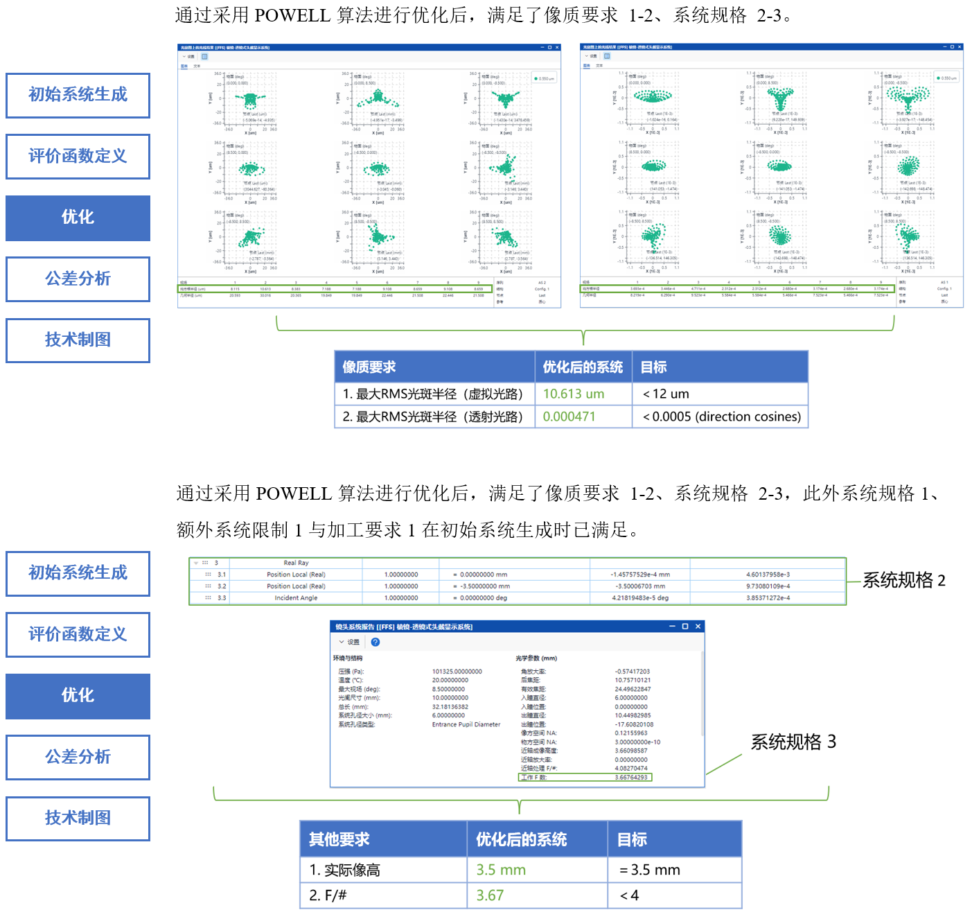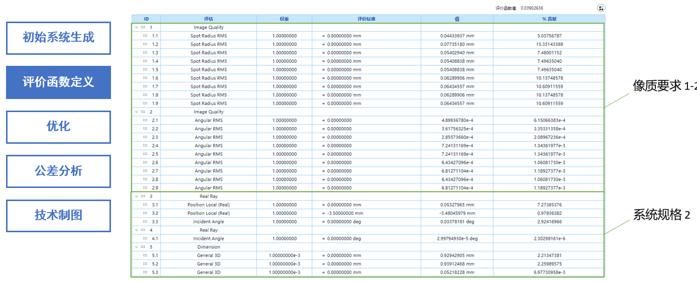 根據系統規格、額外系統限制以及像質與加工要求,定義了各種與之對應的評價函數。