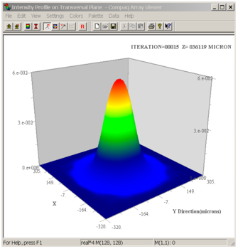 保持默認(rèn)設(shè)置,單擊“Run BPM”按鈕運(yùn)行BMP代碼。與BMP主窗口一起,有兩個(gè)圖形窗口打開。其中一個(gè)顯示反射鏡右端面的模分布,如圖18所示;另一個(gè)窗口顯示光束半徑的收斂性與腔迭代次數(shù)的增加的關(guān)系,如圖19所示。圖19所示的收斂性極限與圖12模式圖左邊放大所示的模光斑大小相當(dāng)一致。