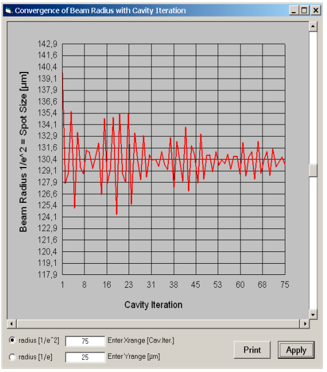 單擊“Plot”按鈕就可以顯示確切的諧振腔結(jié)構(gòu)的穩(wěn)定性。圖形中紅色的十字形符號(hào)所在的位置表示腔的穩(wěn)定性。改變諸如反射鏡曲率半徑這樣的腔參數(shù)以后,再單擊“Plot”按鈕,將出現(xiàn)第二個(gè)十字形符號(hào),它的位置表明了腔參數(shù)改變對(duì)腔穩(wěn)定性的影響。重復(fù)前面的操作,可以畫出一系列的十字形符號(hào),最后畫的這個(gè)總是紅色而以前的變成了藍(lán)色。腔的穩(wěn)定性對(duì)泵浦功率的依賴關(guān)系是非常重要的,因此為了分析這種關(guān)系像在第3節(jié)中描述的那樣對(duì)泵浦功率進(jìn)行調(diào)整。
