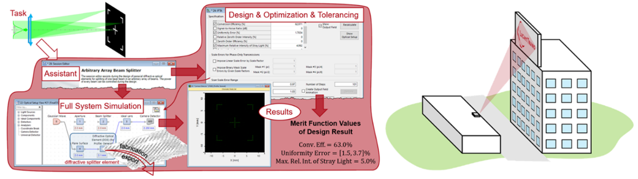 2. 在第二個例子中,我們將通過一個可能的工作流程來設計和分析使用光擴散DOE的光學設置,以在建筑物的正面創建LightTrans標志。