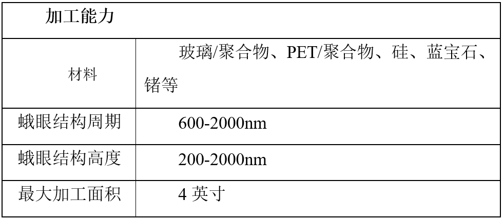 目前,我們采用納米壓印技術,可以在玻璃或塑料膜表面制作大面積的蛾眼結構,實現減反效果。在可見光范圍內可以將材料表面的反射率降低到小于0.2%。在紅外波段,結合納米壓印和等離子刻蝕工藝,可以在硅表面加工蛾眼結構來減少其對紅外光的反射。