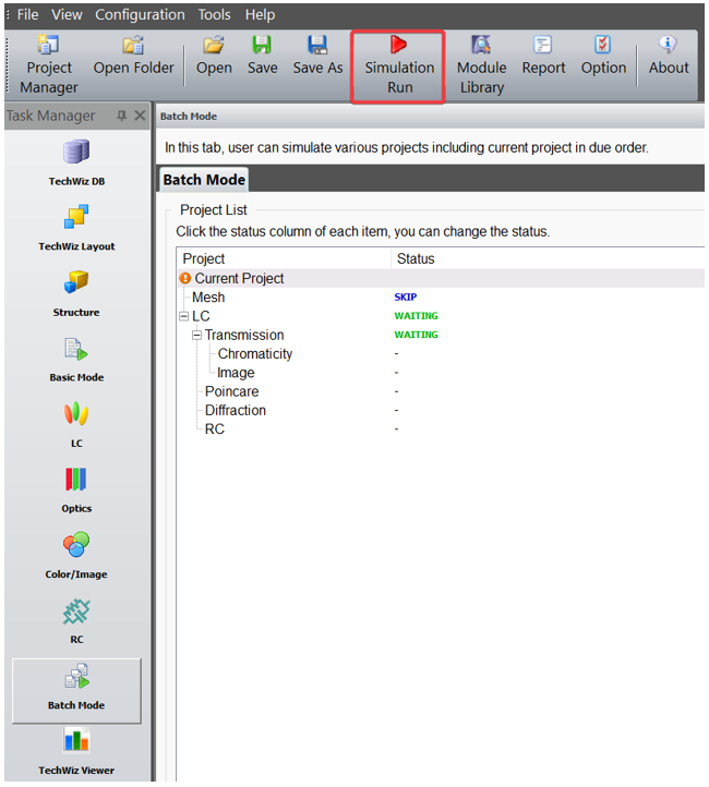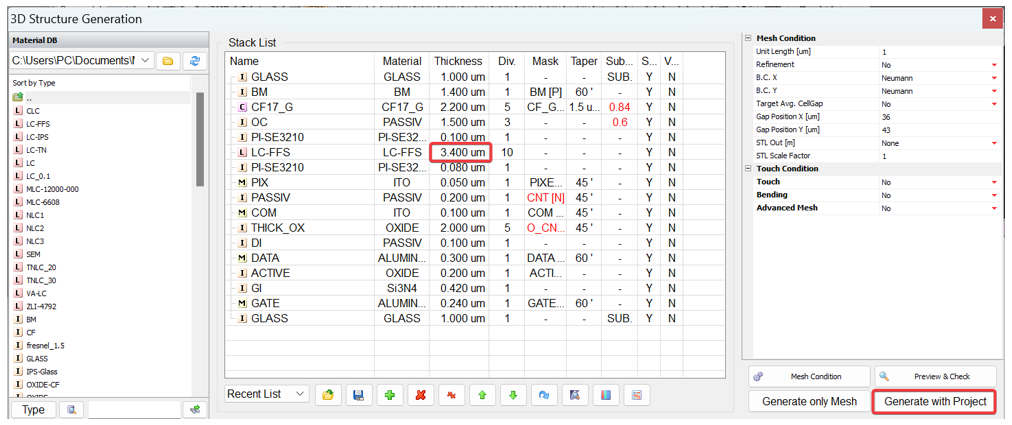 生成3組項目文件,其液晶盒厚(Cell gap)分別為:參考項目和松弛項目為3.4um,按壓項目為2.9um