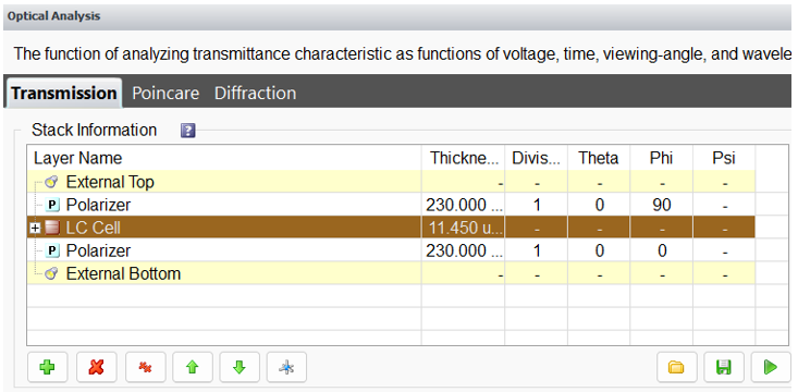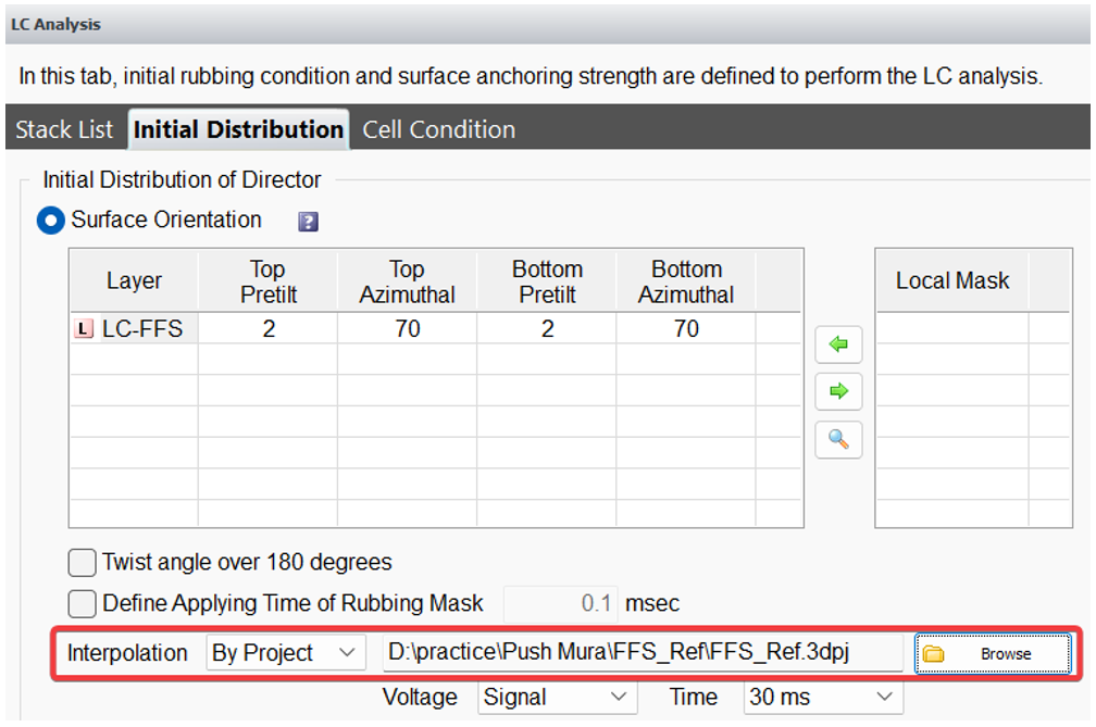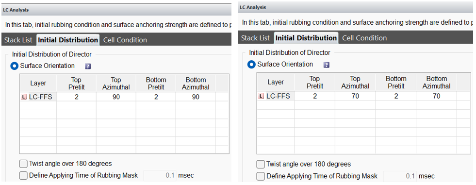 1)液晶初始分布的設置為:預傾角全部為2°,參考項目(Ref)和松弛項目(Relaxation)的方位角90°,按壓項目(Push)的方位角為70°,見下圖