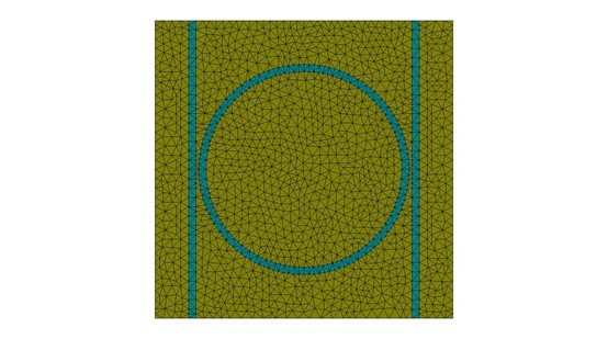 在本案例中,所有進(jìn)入器件的波導(dǎo)具有相同的幾何形狀。通過環(huán)形諧振腔和兩個(gè)平行波導(dǎo)的組裝,建立二維幾何結(jié)構(gòu):