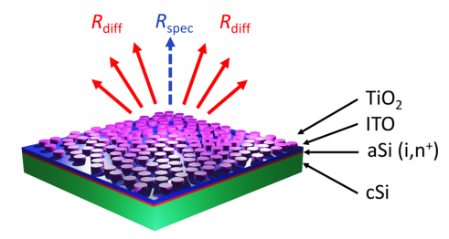 本工作中所考慮的太陽能電池結構示意圖。Rdiff和Rspec表示漫反射和鏡面反射部分。該圓盤是在異質結技術(HJT)后發射極太陽能電池上沉積的,其表面是用非晶硅(aSi)固有層和n+摻雜層鈍化的未拋光的平面硅片ITO薄膜既是減反射涂層(ARC),也是正面觸點。