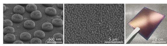 (左圖,中間圖)不同放大倍數的太陽能電池頂部圓盤的電子顯微圖。左邊的圖突出了單個圓盤的特性,而中間的SEM圖突出了樣本的一致性。(右圖)39 × 39 mm涂層太陽能電池的照片。