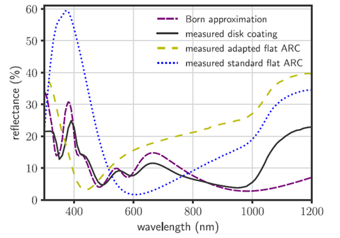通過Born近似計算的圓盤圖案的反射率和單個圓盤的有限元模擬(本文討論的數值模擬是基于有限元方法(FEM)的軟件JCMsuite)。測量圓盤涂層樣品和調整平板的反射率ARC (50 nm厚度的ITO)的圓盤結構。一個標準的平面ARC參考(80 nm厚度的ITO)作為比較。