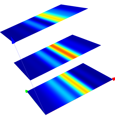 輸出文件fourier_transform_image.jcm包含經(jīng)過光學(xué)系統(tǒng)后的場的傅里葉變換。可以使用笛卡爾輸出后處理來計算相干圖像。下圖顯示了不同z方向切片的圖像(圖像平面沿z方向放置),用于S偏振照明。
