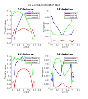 Matlab®腳本data_analysis/run_scan_illumination.m提供對入射角的掃描。它產生了以下圖表,顯示了反射和透射衍射級次的強度: