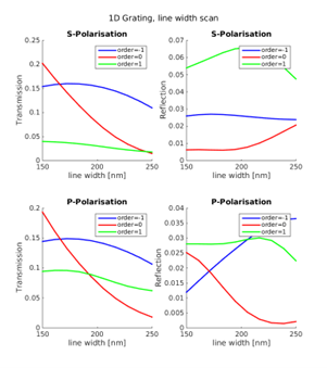 在腳本data_analysis/run_scan_width.m中,光照角度固定時,線柵的寬度從150nm增至250nm。這將產生以下線柵寬度依賴關系: