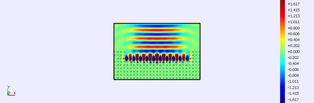 諧振腔的共振頻率和品質因子,除受腔長度影響外,還可能取決于腔表面的褶皺程度。本例在光子晶體諧振腔的表面,設計了波浪形的激光工作物質,組成垂直腔激光器。它可以在單模狀態下穩定工作,并具有平坦的波前。