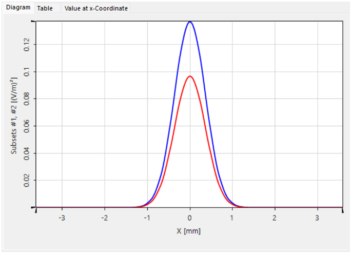 圖4.沿x軸一維曲線疊加(藍(lán)色為兩偏振片平行,紅色為兩偏振片45°夾角)