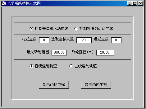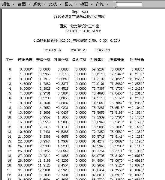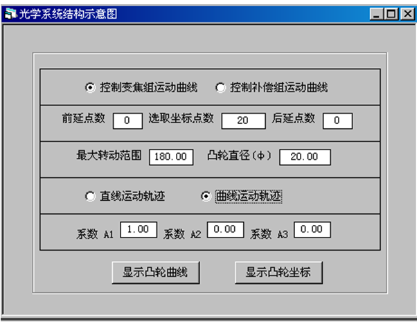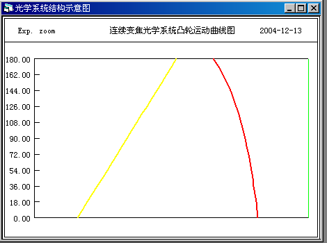 在顯示可變焦距光學系統示意圖的同時,還可自動計算并顯示連續變焦光學系統凸輪曲線。對三組元連續變焦系統,還可根據需要計算任意點數的凸輪曲線以及曲線的坐標值等。對非三組元連續變焦系統,還可根據系統給出的可變間隔數據計算指定點數的凸輪曲線以及曲線的坐標值。