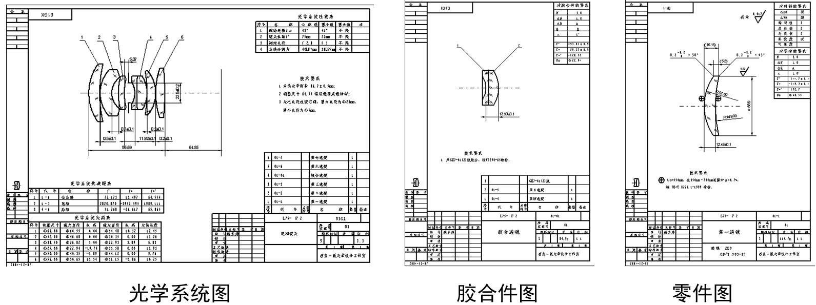 本軟件包有很強的自動繪制各種光學圖紙的功能。在光學系統出圖階段,可以按照標準化的要求,滿足 GB13323-91 光學制圖以及其他一系列諸如光學零件公差配合,零件倒邊倒角的要求,繪制光學系統圖,光學零件圖以及光學棱鏡圖等。