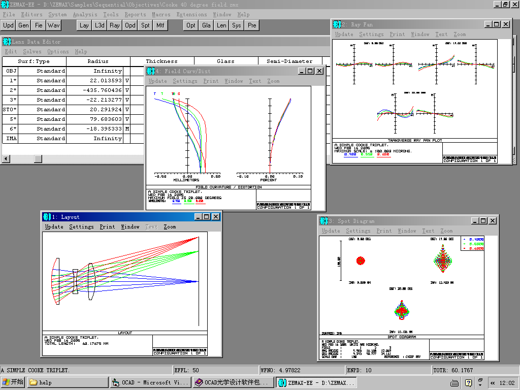 本程序不僅能計算常用的具有軸對稱旋轉表面的光學系統,還可以計算具有偏心和傾斜光學表面的非對稱光學系統;不僅能計算各種定焦距光學系統,還可以計算各種連續變焦光學系統、光學掃描系統以及變形光學系統等;