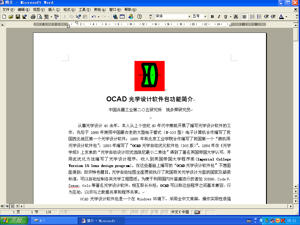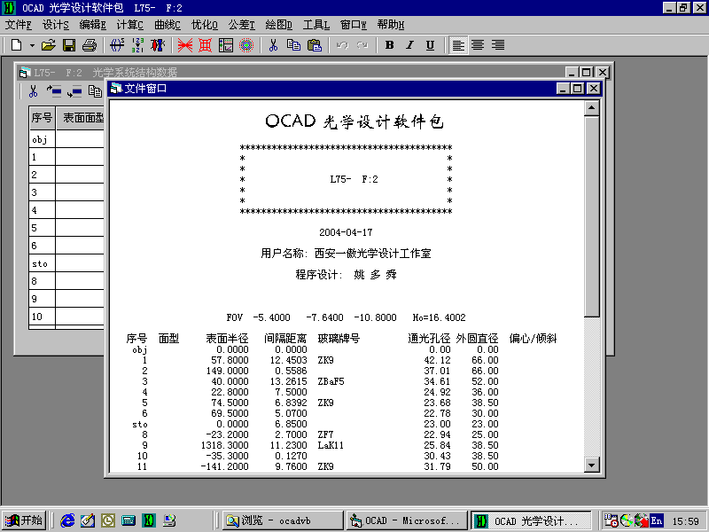 當前國內外優秀的光學設計軟件很多,但大多數都集中在光學系統的優化和像質評價方面,但如何確定光學系統的初始結構,在優化過程中如何隨時貫徹我國有關光學設計標準,特別是貫徹光學零件的表面半徑標準、邊沿厚度標準以及中心厚度標準等都需要在優化過程中及時體現,否則在優化之后再考慮這些勢必會影響優化結果。此外,在系統優化合格之后如何貫徹我國相應光學標準繪制光學圖紙也是光學設計者的繁重工作。為此OCAD光學自動設計程序就是出于這些目的編制的適用性光學設計軟件。為了與國內外一些優秀光學軟件取長補短,該程序設計了與其它有關軟件鏈接互動功能,可以實現和其它光學軟件數據共享,互相轉換,以求在整個光學設計過程中利用不同光學軟件的優勢完成光學設計工作。OCAD還可以與Word文字處理軟件關聯自動把設計過程中的資料及時轉換成Word文文件格式并顯示在接口上便于處理。OCAD光學自動設計程序的主要功能簡介如下。