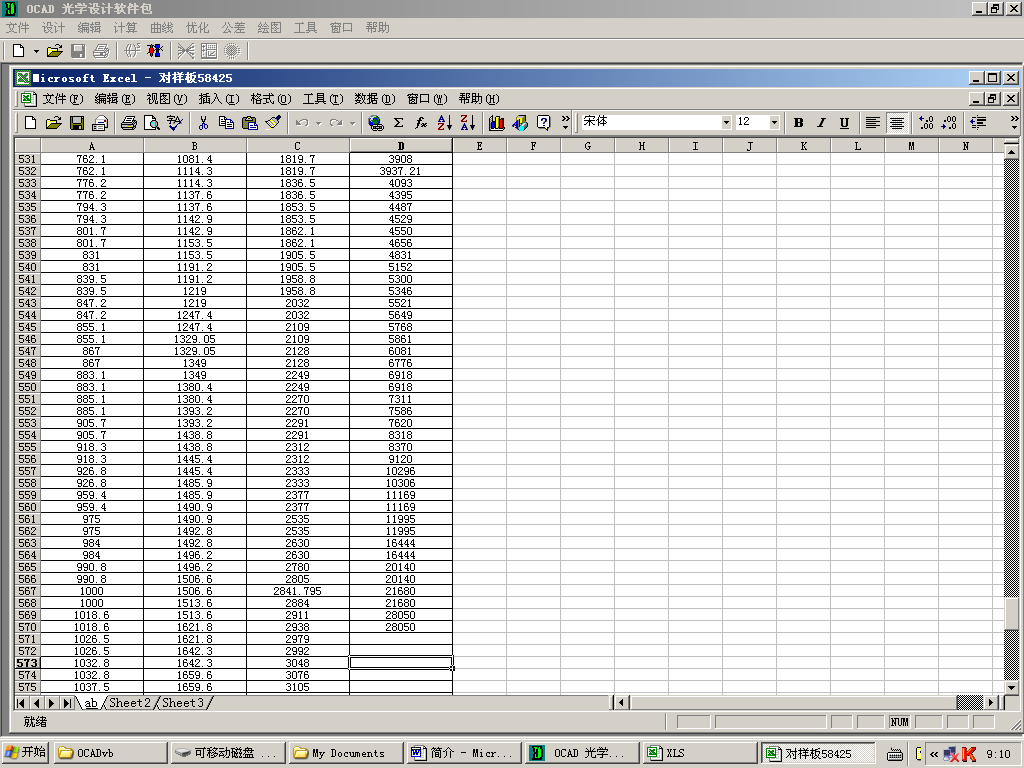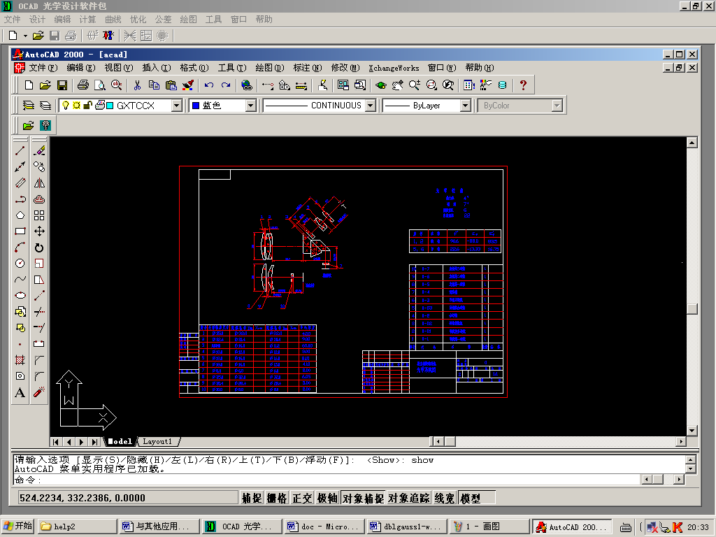 本軟件包具有可與其他應用軟件鏈接使用的功能。由于光學設計軟件不僅只進行光學設計,還要進行設計結果的輸出工作,其中包括計算數據的輸出和設計圖紙的繪制輸出工作。輸出設計數據往往需要經常使用的 Microsoft Word 軟件及Microsoft Excel 軟件等,設計圖紙的繪制除本軟件可以直接繪制各類光學圖紙外,有時也許要應用工程通用的 AutoCAD 應用軟件以及 Solid Work 軟件等。為了便于使用這些有用的應用軟件,本軟件包可以把這些好軟件鏈接在一起,操作十分方便。圖8到圖10分別為本軟件包直接調用被鏈接的Microsoft Word 軟件、Microsoft Excel 軟件以及 AutoCAD 軟件的屏幕界面。