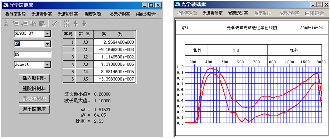 其中玻璃材料數據庫幾乎涵蓋了國內外如CODE Ⅴ、Zemax、OSLO 以及 SOD88 等光學軟件具有的所有光學材料玻璃庫,其中還包括有色玻璃材料,所有玻璃庫用戶都有對其補充修改的功能,便于不斷擴充如圖12所示。