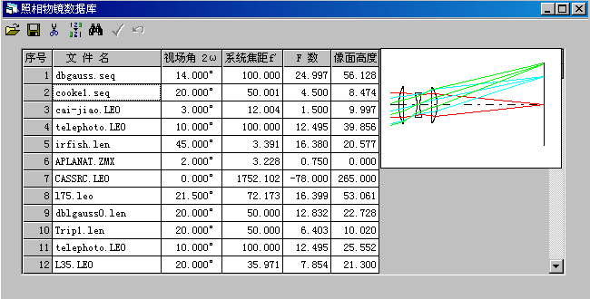 軟件包在文件菜單里為用戶提供了一個典型鏡頭資料庫功能,此鏡頭庫是一個開放式鏡頭資料庫,不僅收入了國內外如CODE Ⅴ、Zemax、OSLO等光學軟件中所列各種專利鏡頭數據及其他專利鏡頭資料2500多,供設計選取和參考。還可及時記錄和存入用戶積累的光學數據資料。