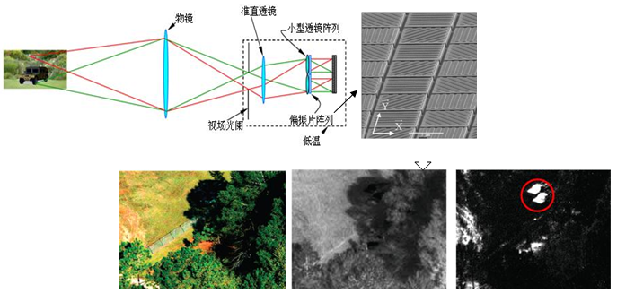 深亞波長納米金屬光柵的特征尺寸,包括周期、縫寬和柵層高度,遠小于入射光波長,其特點是對入射光的偏振態十分敏感。如圖2所示,在紅外熱像儀中,將深亞波長金屬光柵的線柵方向做成0o、45o、90o、和135o,并按照1:1與微透鏡陣列集成,便可同時獲得四個偏振方向的輻射信息,滿足實時偏振成像的要求。偏振成像在軍事防偽裝中有著重要的應用:圖2下方三幅圖分別是對地航拍的可見光圖像、紅外圖像和紅外偏振圖像。從圖中可以看出:對于做了顏色偽裝的卡車,隱蔽在樹蔭下的暗背景中,可見光圖像無法識別;卡車沒有啟動,與周圍環境不產生熱差,紅外圖像也很難識別;以金屬材料為主體的卡車反射或輻射光波的偏振度與地物背景反射或輻射光波的偏振度具有明顯的差異,因此在紅外偏振圖像中可以清楚地觀察到偽裝在樹蔭下的卡車。