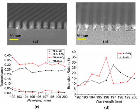 受到微納制作工藝的限制,適用于深紫外波段的亞波長偏振光柵因周期過。<20 nm)而無法被實際制作出來?紤]到金屬光柵表面的SPPs只能由TM偏振而無法用TE偏振激發,我們通過反復優化光柵結構參數,設計并制作了一周期略小于深紫外波長的金屬鋁柵(圖3. a),TM光會因SPPs共振被鋁柵表面吸收和反射,而TE光則因導波模共振發生透射,從而在深紫外波段首次實現反轉偏振透射。隨后,我們利用ALD在光柵縫中共形填充了襯底介質-SiO2(圖3. b),通過增強導波模共振使TE光的平均透過率提高了40%(圖3. c,d)。
